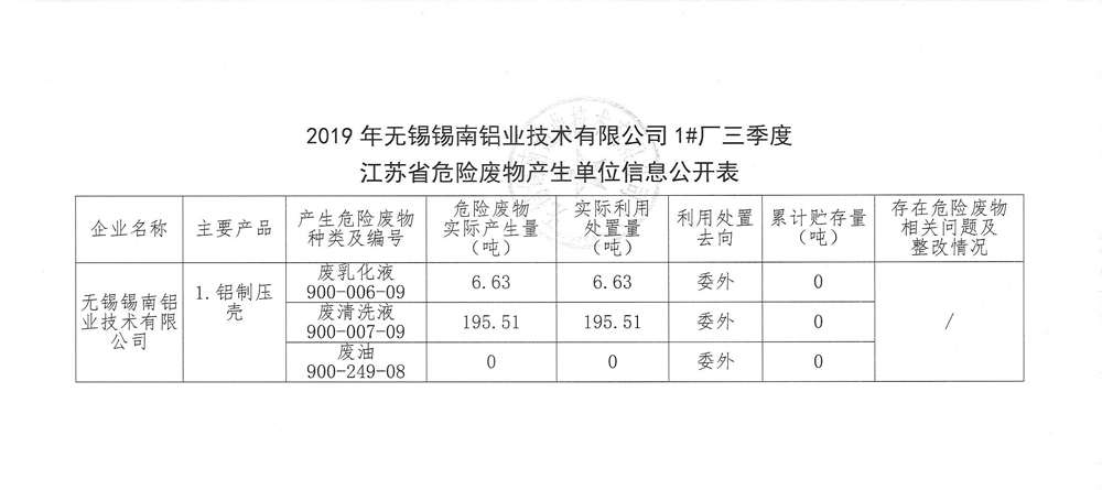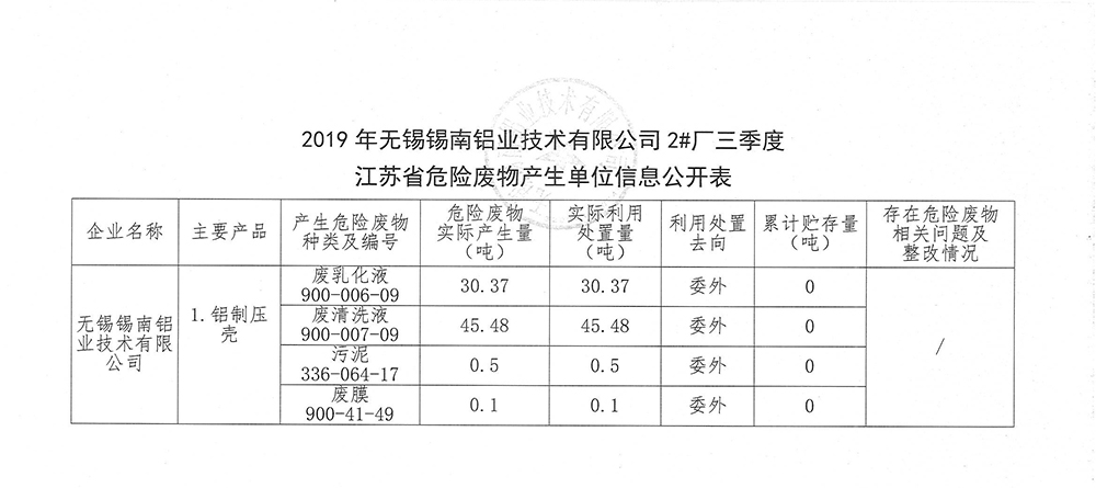 江蘇省危險廢物產(chǎn)生單位信息公開表(三季度)